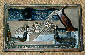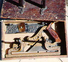| This superb example of a type 2 #42 shows how the tool would have been fitted in the box. A place for everything and everything in it's place. Note how the cutters are incorporated into the case, no extra box was required as found with later types. The filletster bed also fits neatly and has a wooden block at its toe to hold it down. |