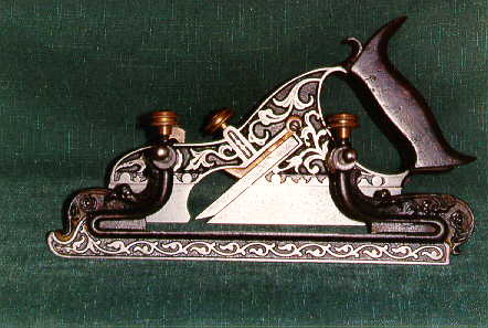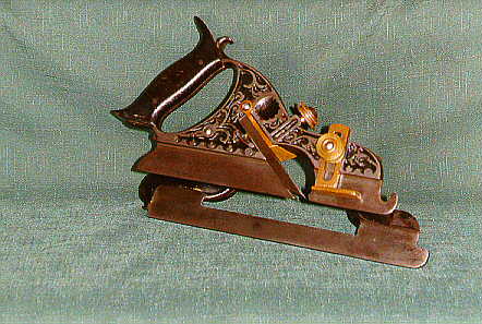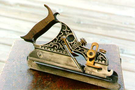 The #41 combined plow, match and filletster plane.Note the distinctive curve of the body terminating with a "hook" at the tote. The fence screws and cutter clamp locking screw are of two piece construction. A brass thumb screw with 3 knurlings and a steel round headed screw through the center. The tote is secured with two pins, the tips of the tote are long and curve gracefully. The filletster cutter slot extends all the way through the top of the cutter. The cutter clamp chip deflector is brass, the deflector portion is shorter than in later models. |